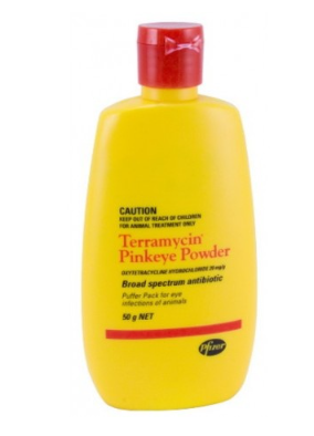 Terramycin Pinkeye Powder contains oxytetracycline hydrochloride 20mg/g in a non-irritant carrier. Broad spectrum antibiotic in a Puffer Pack for eye infections of animals. Terramycin is effective against Moraxella bovis and Rickettsia conjunctivae and has activity against a wide range of secondary invaders including Mycoplasma conjunctivae.